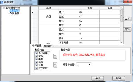 桥架设置单独调出,一次操作就能快速设置,内容相对较全面、形式多样化、标注内容可导入、导出,支持配件载入自创的相关对象族、配件切换预览相对较快速 。