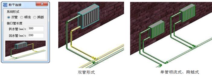 【散干连接】:可实现散热器与干管的连接,支持双管系统,单管顺流式和单管跨越式系统形式。支持设置自动生成的支管的管线长度。