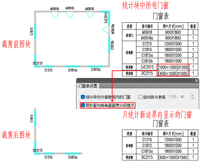 13)改进【门窗表】和【门窗总表】命令,表列宽度改为能随文字的长度自动调整,优化门窗的排序规则,增加当表格太长时是否需要拆分为多个的设置,支持识别块参照和外部参照的裁剪边界,带形窗和转角窗的窗宽支持设置是分段显示还是显示总宽;